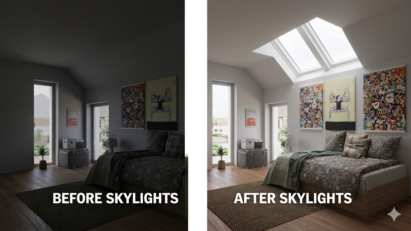 The homeowners can notice a significant increase in natural light, better temperature control, and an aesthetic look and feel in their space. The difference between an outdated and a newly installed skylight is clearly visible in roofing projects’ before & after comparison, where improved clarity, brightness, and sealing make a dramatic impact. Check out the image for reference.