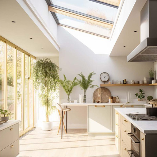 Skylights are an excellent design feature for the kitchen, bringing in natural lighting, promoting energy efficiency, and contributing to the room's overall atmosphere. Skylights can even be opened to bring in additional air and aid in managing odor and moisture in the kitchen. Position skylights in a manner to receive as much sunlight as possible while it doesn't overheat. Diffuse sunlight reaches north-facing skylights during the day, while the south-facing skylights receive direct sunlight.