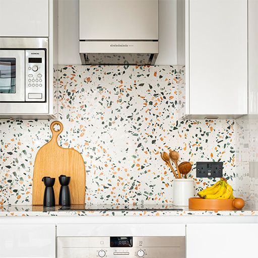 Terrazzo is a composite material consisting of chipped pieces of granite, marble, quartz, or glass embedded in a cement or resin matrix. It has a favorable reputation for strength, distinctive form, and versatility and, therefore, makes a prime selection for interior design in kitchens.