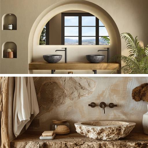 From natural wood vanities, to stone accents walls and pebble shower floors, these elements bring nature inside. Their textured qualities provide an element of warmth and depth to any luxurious bathroom renovation with a tranquil minimalist look. Combining stone basins with marble countertops or the flooring of river rocks is well-liked in design-oriented bathrooms.
