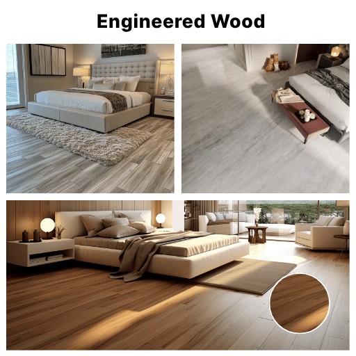 2. Engineered Wood: Engineered wood gives you the beauty of real wood with better resistance to temperature and humidity changes. Made from multiple bonded layers, it stays more stable than solid wood, making it ideal for fluctuating climates. While it can be refinished once or twice (depending on the top layer), it’s slightly less durable over the long term than solid hardwood.
