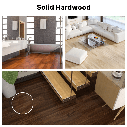 1. Solid Hardwood: Nothing compares to the warmth and timeless elegance of solid hardwood flooring. It instantly elevates interiors, adding value and authenticity to your space. Because it can be refinished multiple times, hardwood can last for decades if properly maintained. The only downside is its sensitivity to moisture as it expands and contracts with humidity and isn’t ideal for bathrooms or basements.